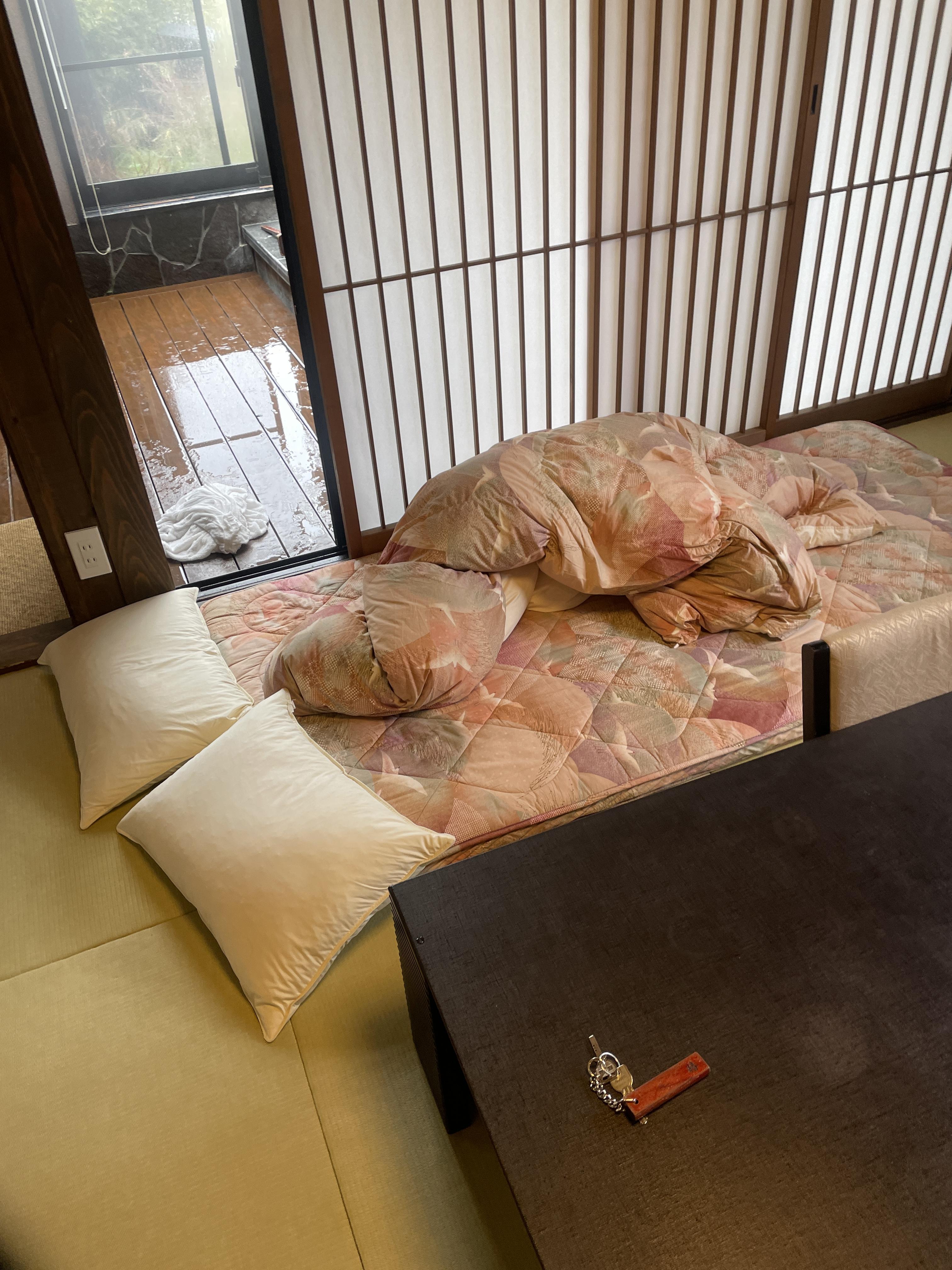 Tsubaki 객실은 Toshoan의 일반 객실 중 가장 큰 객실입니다. 이것 때문에 가격이 몇천원 더 비쌌던 기억이 납니다. 위층에는 다락방이 있어 유후다케를 바라볼 수 있는 휴게실입니다. 나무계단을 올라가니 의자가 두 개 있었다. 솔직히 온천을 즐기기 위해 여기까지 올라갈 시간이 별로 없었어요. (나무계단은 수건건조용으로 아주 잘 사용했습니다)